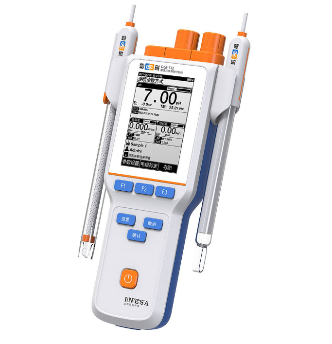 雷磁DZB-712便攜式多參數分析儀 【主要特點】 ● 采用高清液晶屏幕,顯示清晰 ● 溫度單位可選:℃ 和 °F。 ● 支持開機自診斷、自動關機、斷電保護和恢復出廠設置等功能 ● 支持固件升級功能,允許功能擴展和個性化要求 ● 支持IP65防護等級 ● 標配三復合pH電極、復合電導電極、極譜法溶解氧電極、電極掛架、硅膠保護套、腕帶、便攜式手提箱和校準溶液 一機多用 ● 內置pH/pX、電導、溶解氧3個測量單元 ● 檢測項目:pH/ pX值、離子濃度、mV值、電導率、電阻率、TDS、鹽度、溶解氧、溶解氧飽和度、溫度 智能檢測、自動識別 ● 智能判別終點:支持自動讀數、定時讀數、定時間隔讀數、手動讀數 ● 支持自動溫度補償,自動標定,電極診斷 數據管理,信息追溯 ● 支持數據存儲(各500套)、查閱、刪除、傳輸和打印 ● 符合GLP,實現數據追溯 ● 支持連接標準RS-232串口打印機,直接打印測量結果,打印格式可選 ● 具有USB接口,通過專用通信軟件與PC連接,實現數據傳輸 ? pH/離子測量功能: ● 自動識別GB、DIN、NIST等多組緩沖溶液,支持自定義標準溶液及標液組,最多5點標定 ● 內置Na+、K+、NH4+、Cl-、F-等多種離子模式,允許用戶自建 ● μg/L、mg/L、g/L、mol/L、mmol/L、PX多種離子濃度單位快速切換 ● 測量模式:直讀濃度法測量、標準添加法測量、樣品添加法測量、GRAN法測量 電導測量功能: ● 在量程范圍內,具有自動溫度補償、自動量程切換等功能 ● 自動識別電導標準溶液,支持1-3點電導電極標定 ● 支持不補償、線性、純水補償等多種電導率補償方式 ● 參比溫度20℃或25℃可選 ● 支持自動頻率切換,配套1.0常數電極可覆蓋全量程測量(20μS/cm以下樣品建議選用0.1常數或者0.01常數電導電極測量) 溶解氧測量功能: ● 支持自動溫度補償、自動大氣壓補償(單位可選kPa、mbar、Torr、Atm) ● 支持零氧標定和滿度標定 ● 支持手動鹽度補償功能 電源管理 ● 大容量鋰電池供電,支持連接PC和移動電源充電 ● 具有電池欠壓提醒功能和充電狀態提醒功能 ● 支持背光調節