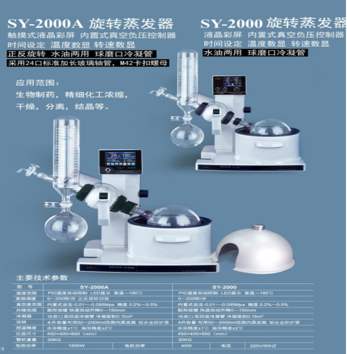 商品名稱:上海亞榮旋轉蒸發器SY-2000(標配款) 商品貨號:HD201801633 品牌:亞榮|yarong SY-2000標配版 液晶彩屏 內置式真空負壓控制器時間設定 溫度數顯 轉速數顯水油兩用 球磨口冷凝管 主要技術參數 :