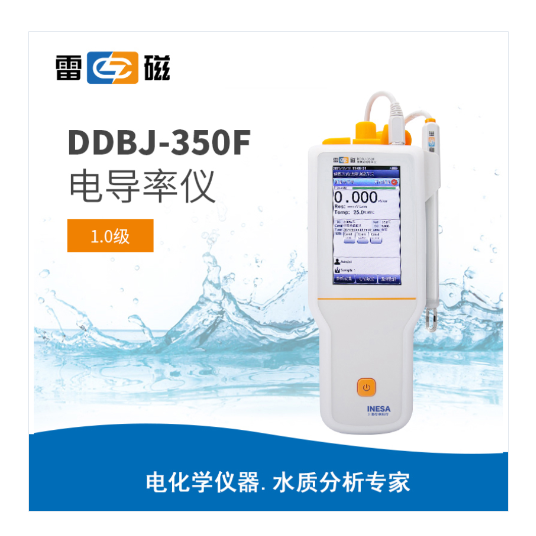 雷磁便攜式電導率儀DDBJ-350F 【主要特點】 ● 采用高清彩色液晶觸摸屏,顯示清晰 ● 溫度單位可選:℃ 和 °F; ● 參比溫度20℃或25℃可選 ● 支持開機自診斷、自動關機、斷電保護和恢復出廠設置等功能 ● 支持固件升級功能,允許功能擴展和個性化要求 ● 支持IP65防護等級 ● 標配復合電導電極、電極掛架、硅膠保護套、腕帶、便攜式手提箱、校準溶液 智能檢測、自動識別 ● 智能判別終點,支持自動讀數、定時讀數、定時間隔讀數、手動讀數 ● 支持自動/手動溫度補償 ● 自動識別4種GB電導標準溶液,支持1-3點電導電極標定 ● 支持不補償、線性、純水補償等多種電導率補償方式 ● 支持自動頻率切換,配套1.0常數電極可覆蓋全量程測量(20μS/cm以下樣品建議選用0.1常數或者0.01常數電導電極測量) 數據管理,信息追溯 ● 支持數據存儲(各1000套)、查閱、刪除、傳輸和打印 ● 支持多種查閱方式,查閱結果以曲線方式顯示 ● 符合GLP,實現數據追溯 ● 支持連接標準RS-232串口打印機打印測量結果,打印格式可選 ● 具有USB接口,通過專用通信軟件與PC連接,實現數據傳輸;支持連接LIMS系統。 電源管理 ● 大容量鋰電池供電,支持連接PC和移動電源充電 ● 具有電池欠壓提醒功能和充電狀態提醒功能 ● 支持背光調節 雷磁便攜式電導率儀DDBJ-350F