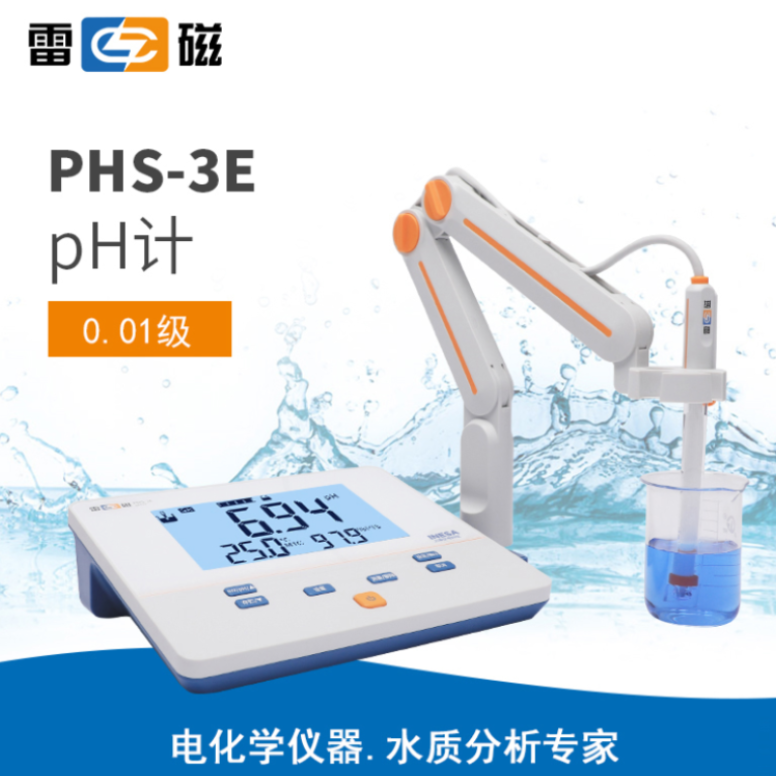 雷磁PHS-3E型pH計【主要特點】● 高清液晶顯示,按鍵操作● 支持自動關機、斷電保護和恢復出廠設置等功能● 支持IP54防護等級● 標配三復合pH電極、電極支架、防塵罩和校準緩沖粉劑智能檢測、自動識別● 智能判別終點,支持平衡測量模式和連續測量模式● 支持自動/手動溫度補償● 支持1-3點pH電極標定● 自動識別GB 4.00pH、6.86pH、9.18pH三種pH標準緩沖溶液,支持自定義pH緩沖溶液數據管理● 支持數據存儲(50套)、查閱、刪除